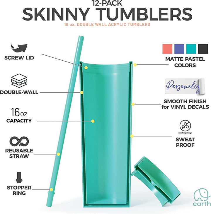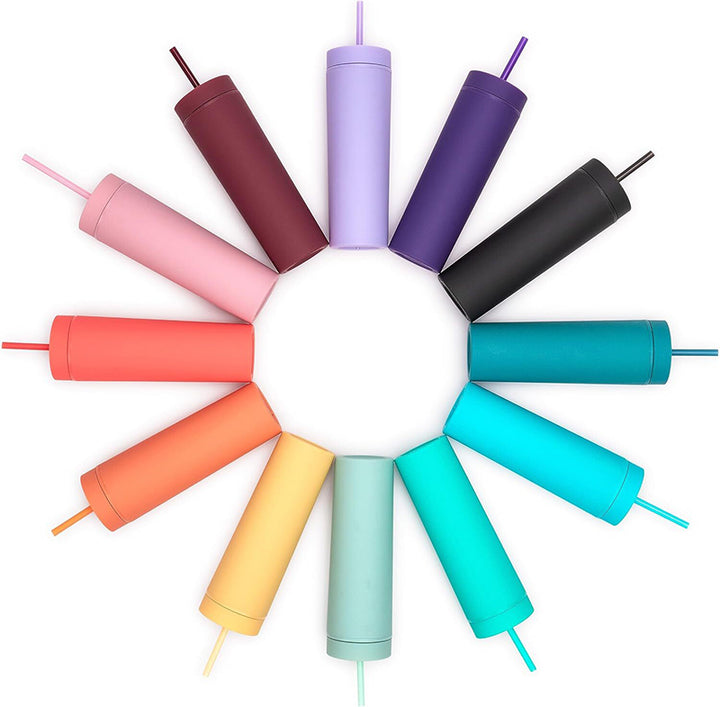 Each 16 Oz Color-Mix Acrylic Tumler is crafted from durable, BPA-free double-wall acrylic that helps keep cold drinks cooler for longer while preventing condensation on the outside. The slim 16oz shape fits comfortably in cup holders, backpack side packs, and daily carry bags, making it easy to use at work, school, gyms, and events. The screw-on lid reduces spills, while the reusable straw with a stopper ring adds convenience for on-the-go use. Lightweight yet sturdy, these tumblers are designed for daily hydration, bulk crafting projects, event setups, and eco-friendly gifting. The matte finish not only looks modern but also helps decals adhere smoothly and stay in place. Dishwasher safe (top rack) and reusable, they offer a sustainable alternative to single-use cups. They come with a matching color straw and a cleaning straw brush.