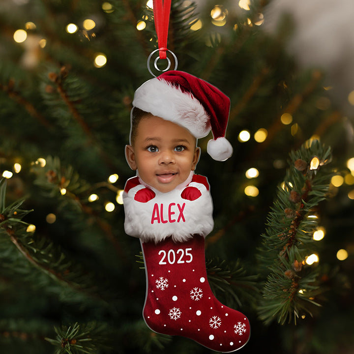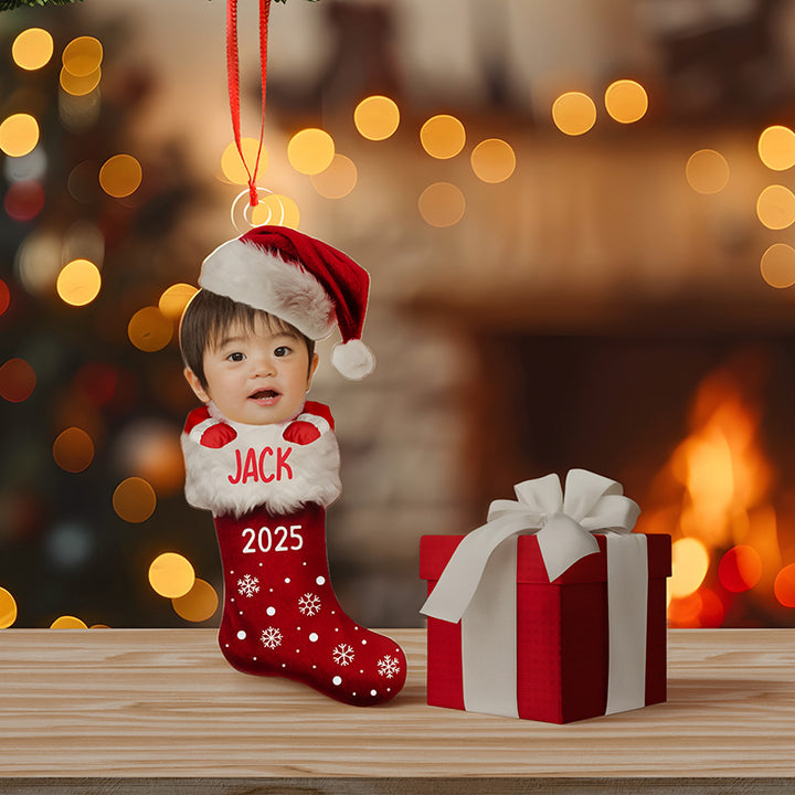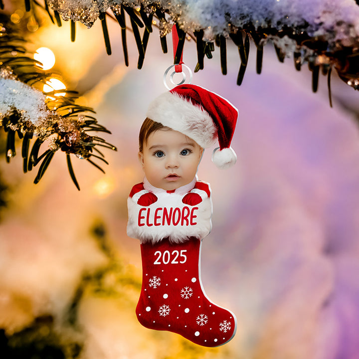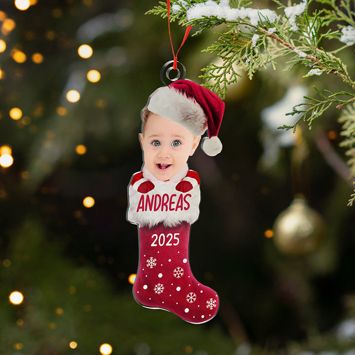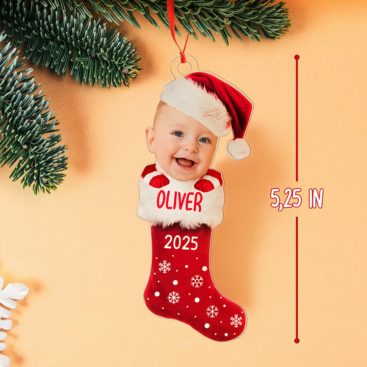 The ornament is precision-cut into the shape of a classic red Christmas stocking. The design's highlight is the custom photo of your baby's face.