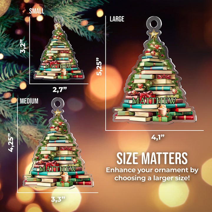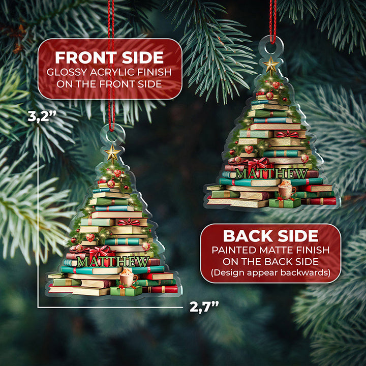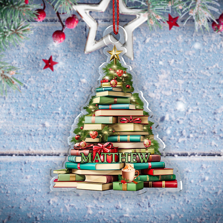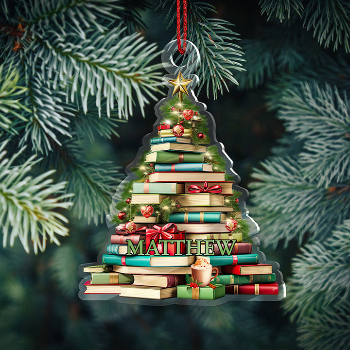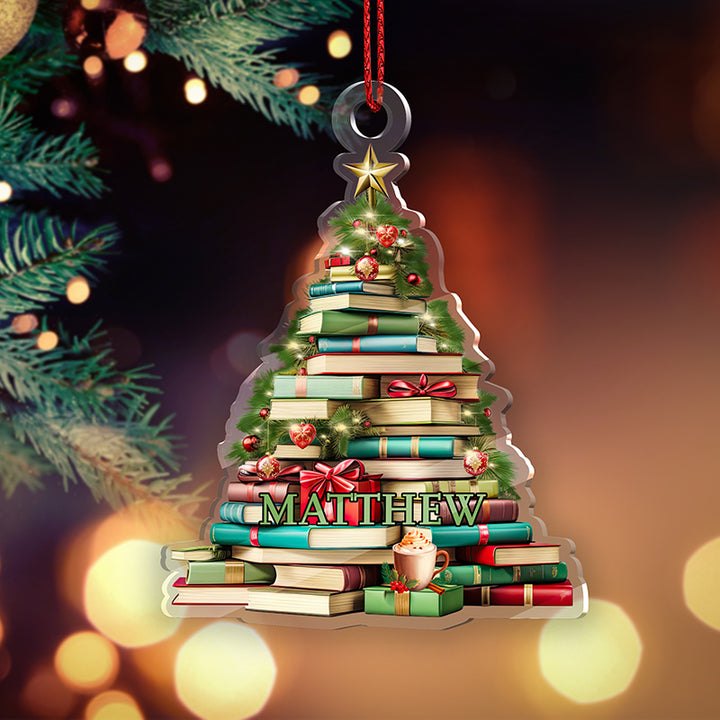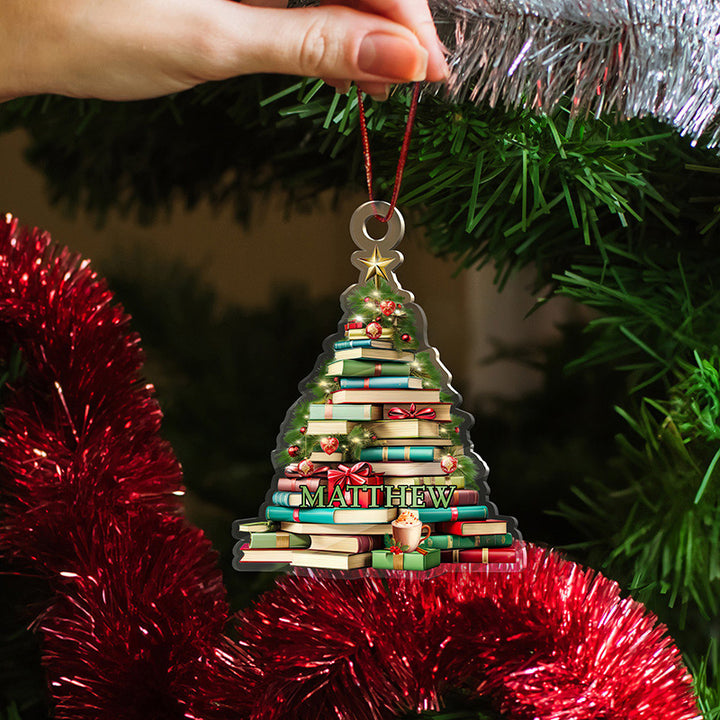 A custom-shaped ornament depicting a Christmas tree made from a stack of colorful books.