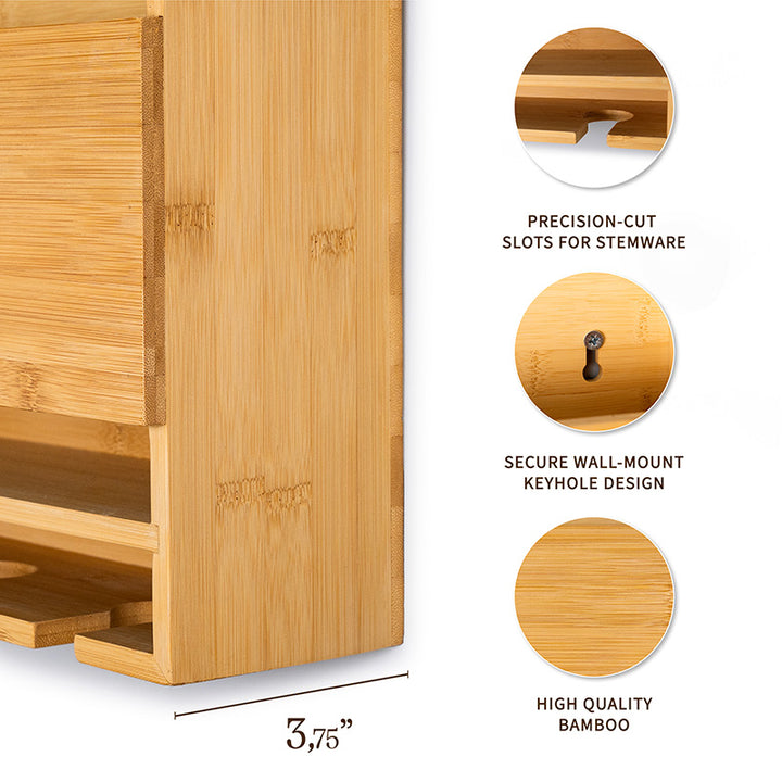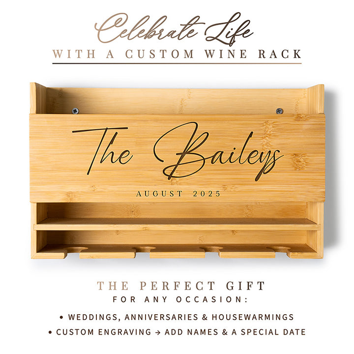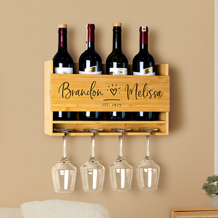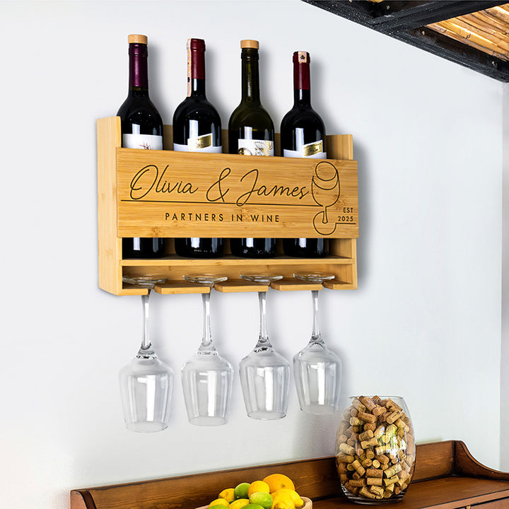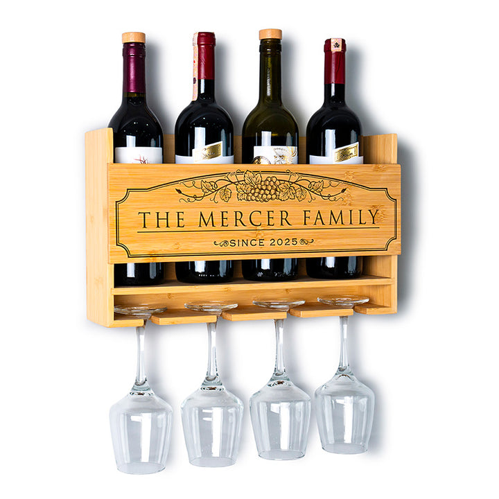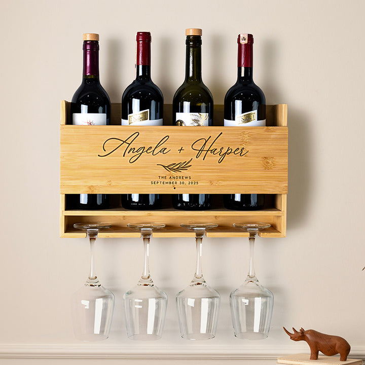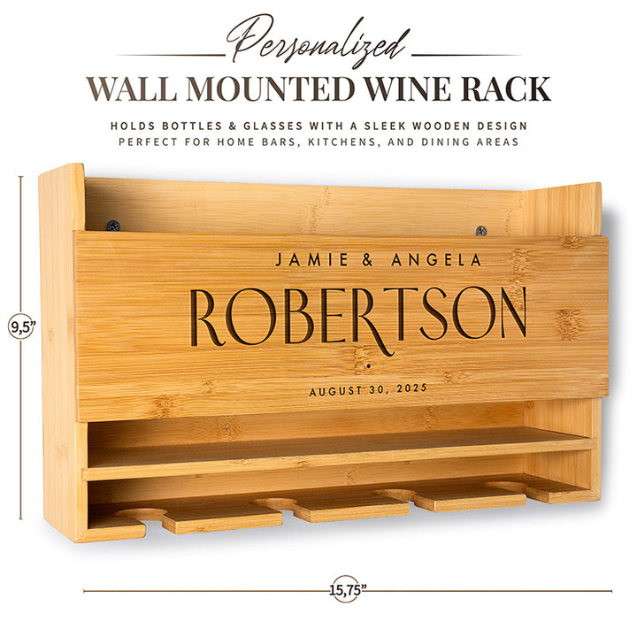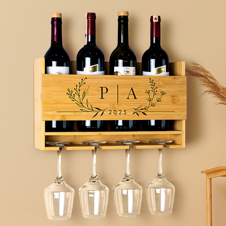 Are you looking to truly upgrade your interior design and celebrate life’s most cherished moments? Then discover this gorgeously crafted, personalized wall-mounted wine holder. This high-quality wooden fixture is designed specifically for both visual elegance and outstanding functionality. It offers a chic, stylish method for displaying your favorite wine bottles. Furthermore, it elegantly keeps your stemware (wine glasses) secured in specially, precision-cut slots.