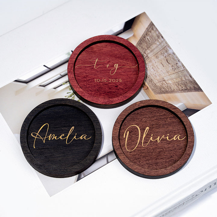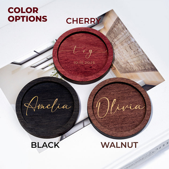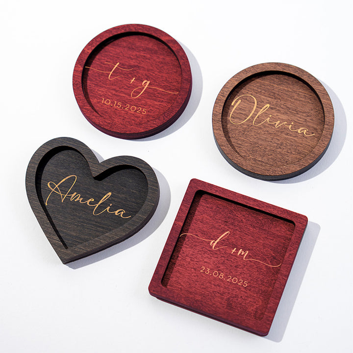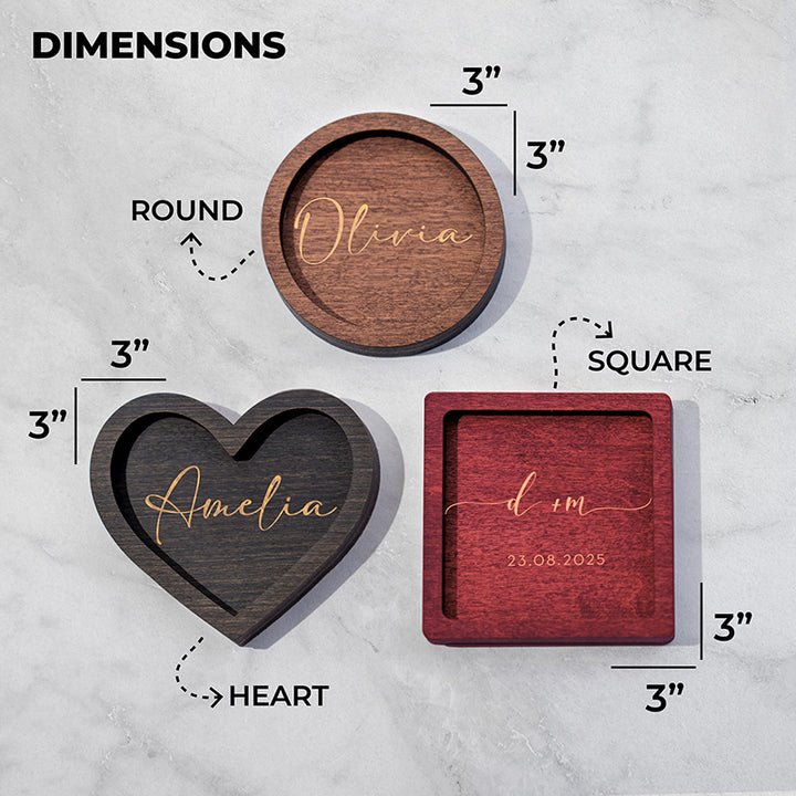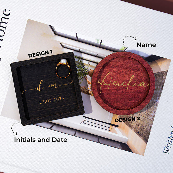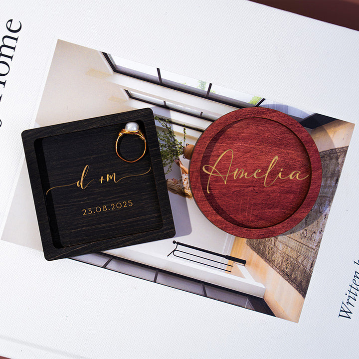 Choose from 3 chic forms: square, heart, and circle. And 3 gorgeous finishes: walnut, cherry, or black. Each dish can be personalized in gold, either with her name or a couple’s initials, making it perfect for those who like to keep wedding rings in a dedicated, elegant space. CNC precision engraving ensures each design is flawless and long-lasting. With two distinct design concepts, this ring dish balances practicality with meaningful customization, creating a small keepsake she’ll treasure every day.