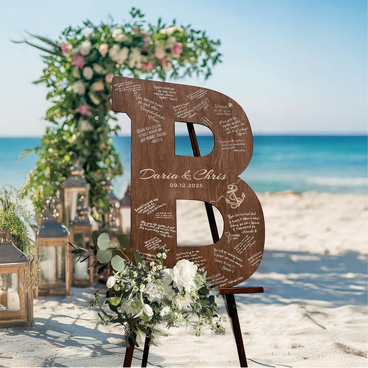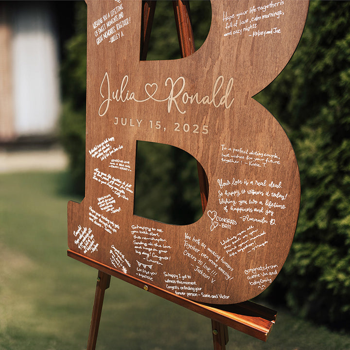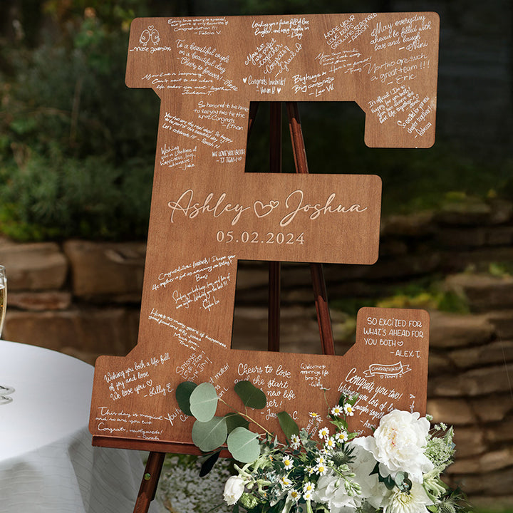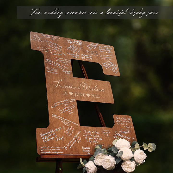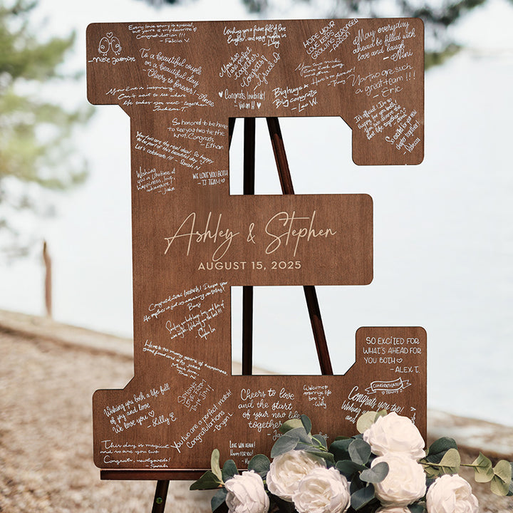 Complete your wedding decoration with an Alternative Custom Guestbook. Our personalized wooden letter guestbook alternative showcases large, finely crafted initials personalized with your names and wedding date. With every letter of the alphabet available, each piece provides generous space for engraving, creating a memorable keepsake for weddings and celebrations. With its large size options from 9" to 30", multiple wood finish color options, and alternative engraving designs, this guestbook will bring an elegant and refined touch to your wedding, engagement party, or rehearsal dinner. More than just a guestbook, this wooden letter doubles as stylish décor you can proudly display at home. Its quality craftsmanship and custom engraving turn it into a timeless keepsake that celebrates your special day for years to come.