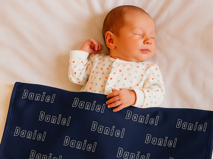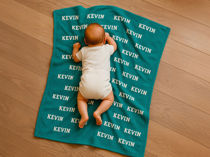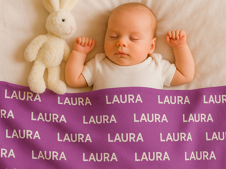 A clean, modern design featuring the name of your choice repeated across the entire blanket.