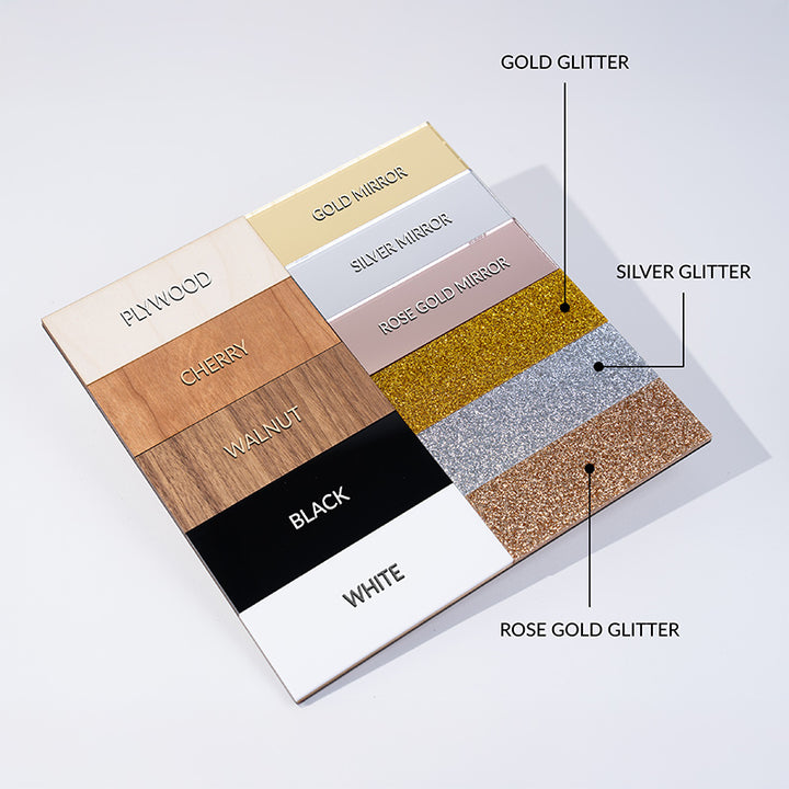 GLITTER ACRYLIC, MIRROR ACRYLIC, SOLID ACRYLIC, WOOD |