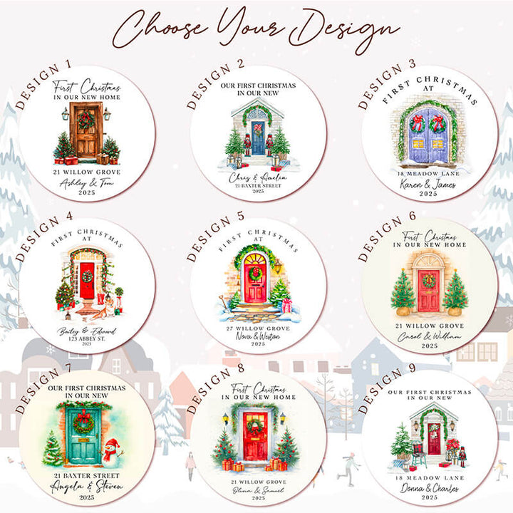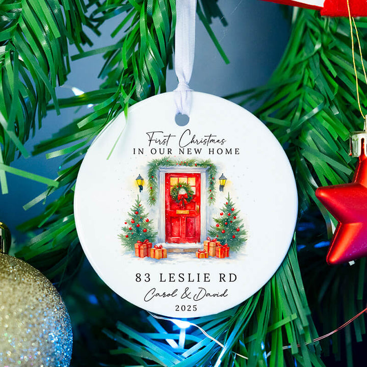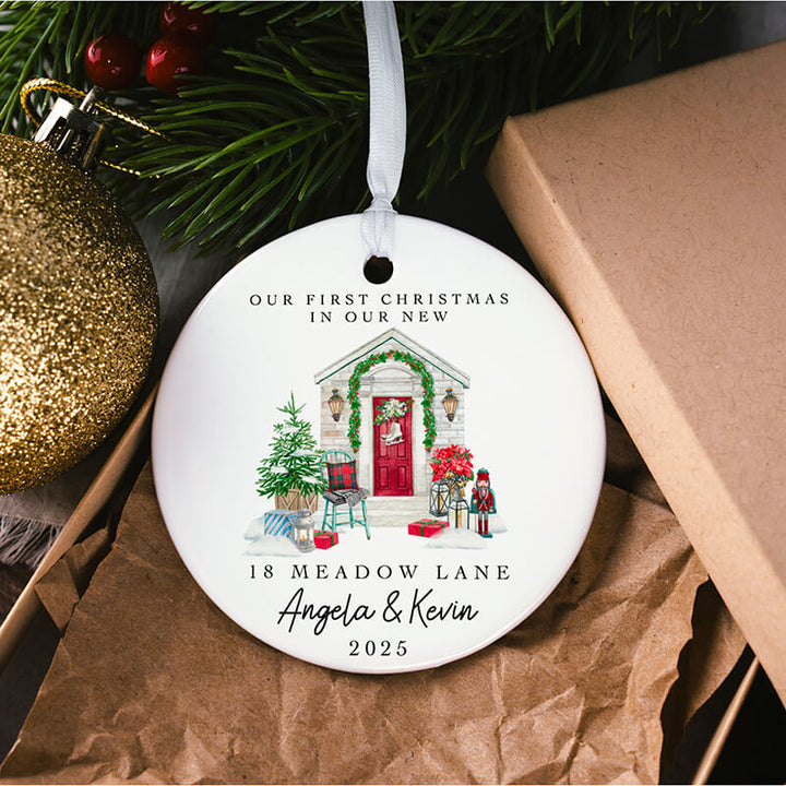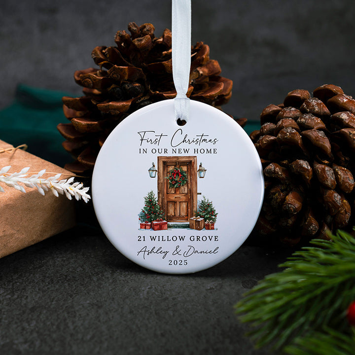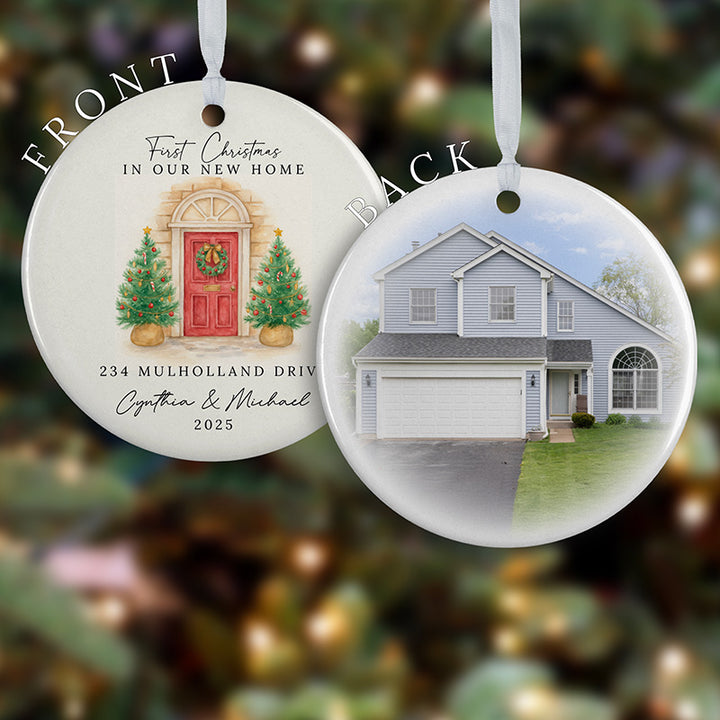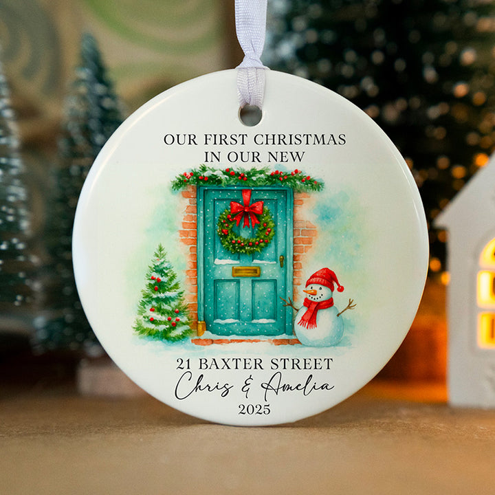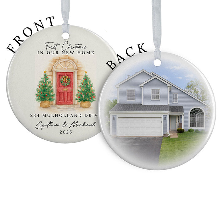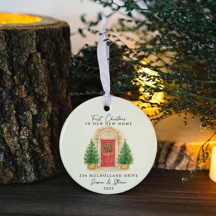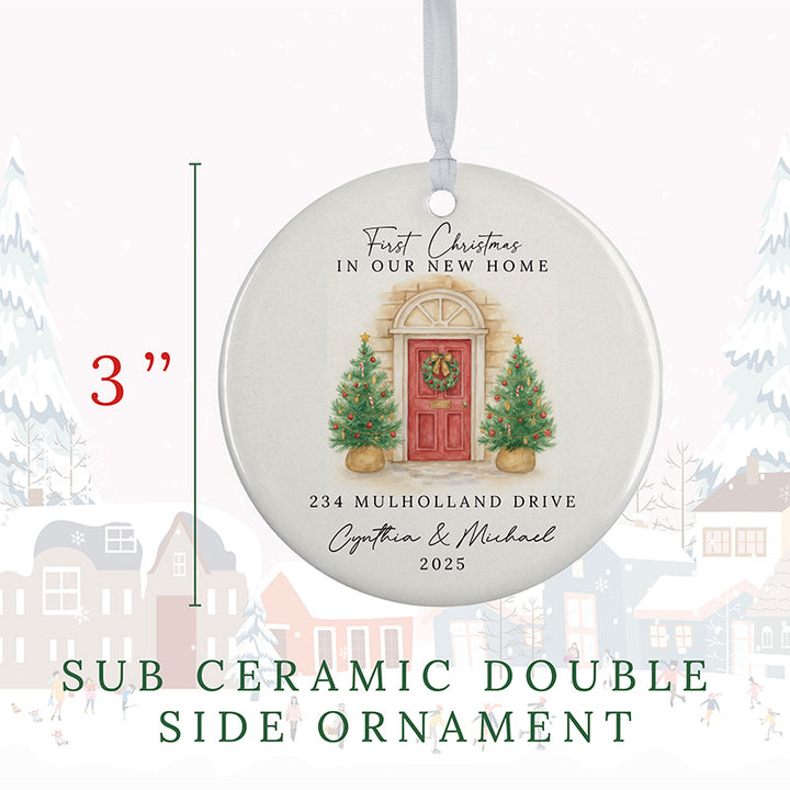 There is more to celebrate this Christmas; your new home that you decorate not just with new furniture, but also with new hopes as bright as your Christmas Tree. The soft glow of holiday lights spilling through fresh windows, the scent of pine drifting across unfamiliar rooms slowly becoming yours, and the quiet excitement of new traditions waiting to be born. This double-sided ceramic ornament captures exactly that feeling: the charm of a beautifully illustrated front door adorned with Christmas touches, and the personal story of your own home printed on the back. Every year you hang it, you’ll be transported back to this milestone season—the year everything began anew.