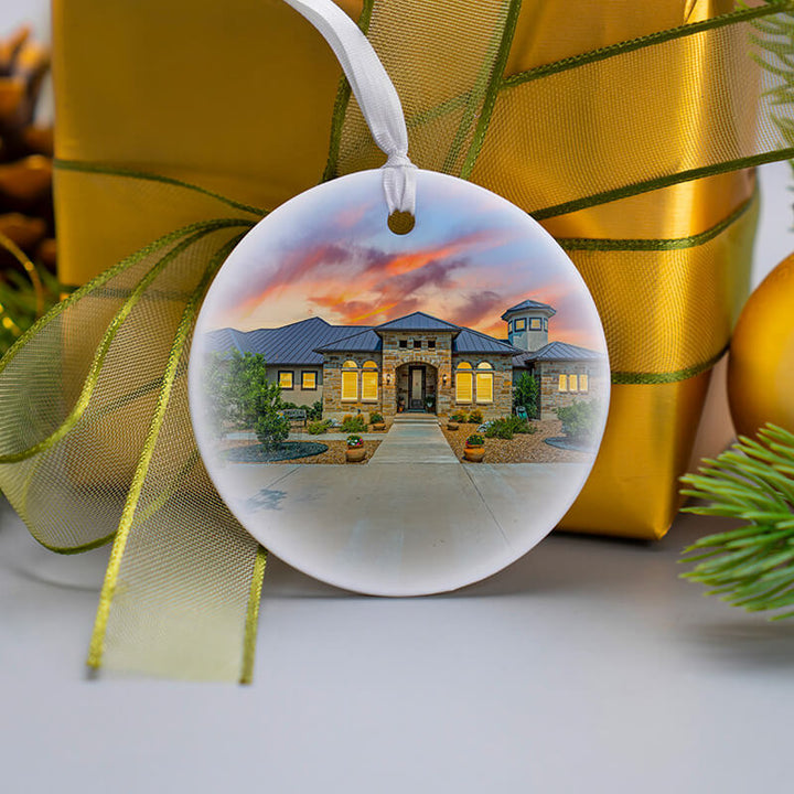 At the moment, this specific material and print method are only available in the classic round shape. Ceramic ornaments require molds that are cast individually, and this model currently comes around only. In the future, we may introduce additional shapes — but for now, the round silhouette offers the most elegant framing for both the artwork and your custom home photo.