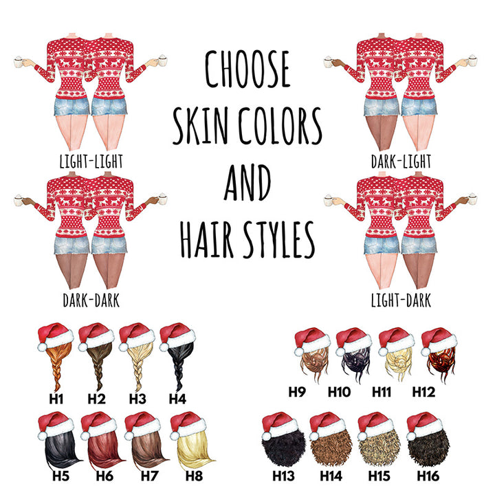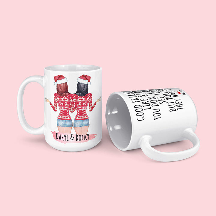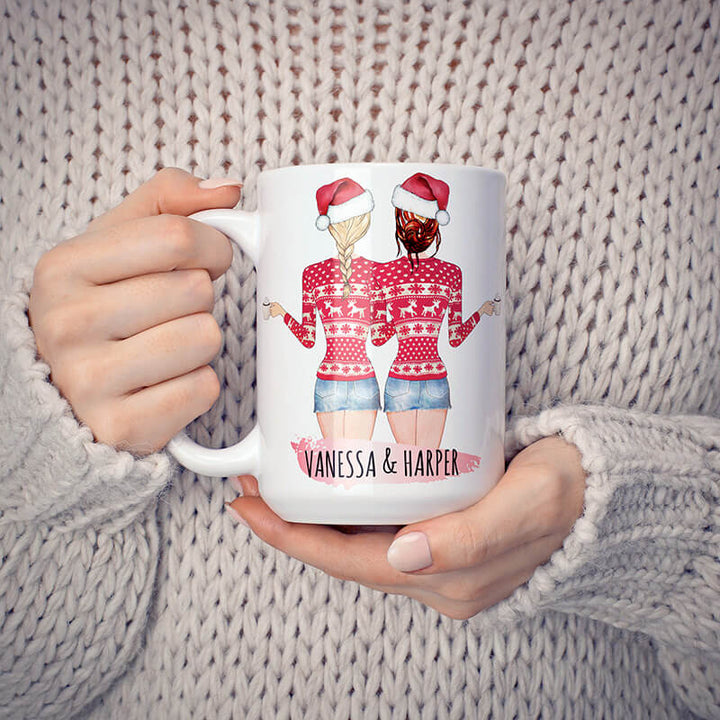 The front side of the mug, which means you’re holding it with your right hand, shows an illustration of two best friends from the behind in vivid colors, while the back side of the mug is showing a meaningful and touching quote. The illustration is decked out in matching Christmas sweaters and festive Santa Hats.