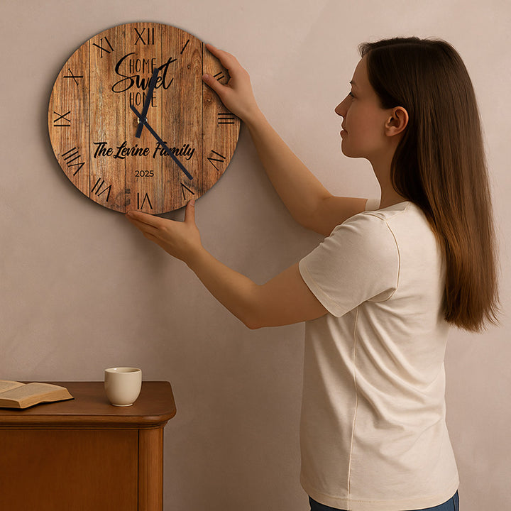 Introduction: Complete your home’s decoration with a unique Wall Clock that you can personalize with your family name and any specific date you want. With the “Home Sweet Home” phrase and natural wood backgrounds, it will spread a warm vibe and make you feel “finally you are home”. Our customizable wall clocks are also a great new home gift for your loved ones. Size, background, and design options give you a large area to turn this housewarming gift into a long-lasting keepsake for the receiver.