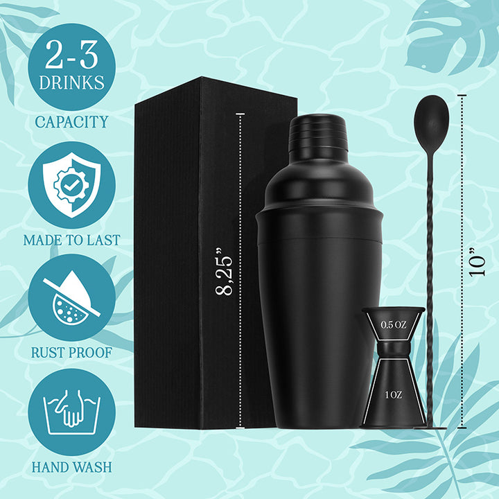 This shaker offers practical use with its leak-proof giggle cap and ice stainer. 18oz capacity allows you to prepare 2-3 drinks at once for your guests. This shaker set kit is crafted from high quality stainless steel which is totally safe-to-drink and food grade. To preserve the chic matte black finish, hand wash is recommended.