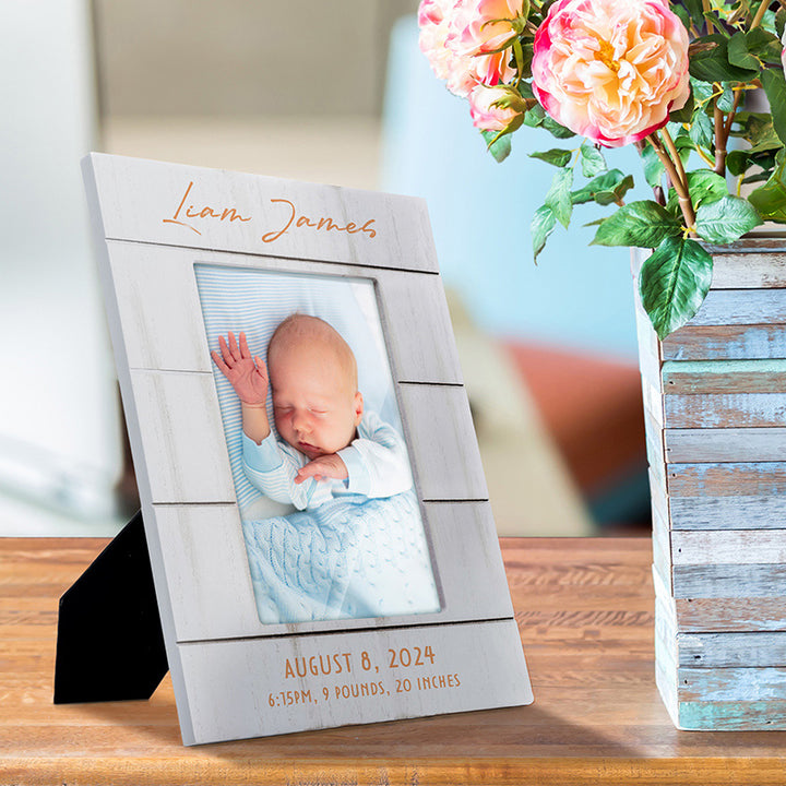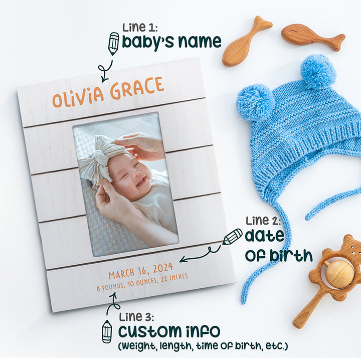 E Welcome your little miracle into the world with our Rustic Personalized Baby Picture Frame! Featuring a warm, distressed wood-inspired design, this frame transforms your newborn’s first moments into a timeless keepsake. With 6 font options and 5 font colors, you can fully personalize the frame with your baby’s name, birth date, and weight. Perfect for adorning a nursery, a cozy corner, or a desk, it’s a thoughtful gift for parents, grandparents, or close family — a daily reminder of life’s sweetest new beginning. Memories deserve more than just a phone screen; let them shine in a charming, rustic display every day.