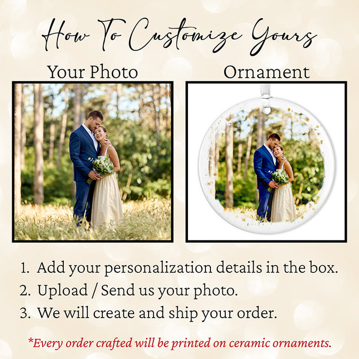Crafted from durable ceramic bisque, each ornament beautifully showcases your picture with soft painterly details, subtle gold accents, and a customizable text layout. Whether you add your family name, wedding date, a short quote, or meaningful words… the ornament becomes uniquely yours.