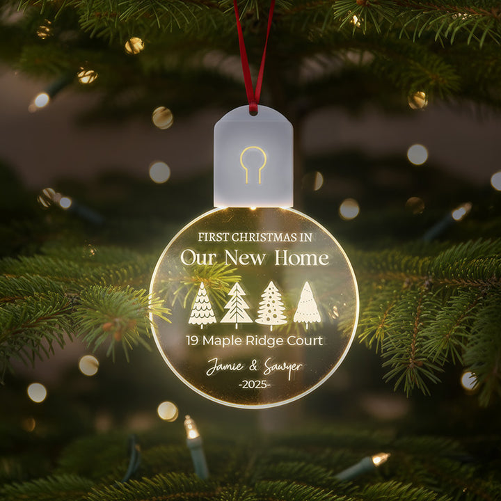 What makes your Christmas unforgettable? Being in a new home for the first time? Absolutely! And this big step in your life deserves a Christmas celebration. The echo of fresh memories, the smell of the first tree, the quiet gratitude of beginning a new chapter. This glowing acrylic ornament captures that feeling like nothing else. When the LED light gently illuminates the engraved little pine trees, your address, and your names, it becomes a soft beacon of both nostalgia and hope.