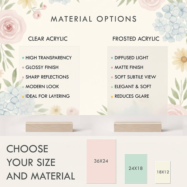 Here at Giftshire, our aim is to ensure every element is flawless. Consequently, we provide numerous customization choices to harmonize with your particular decorative concept. You may select between two captivating arrangements of flowers: a conventional centered pattern or a design that features a complete floral border. Choose the perfect manufacturing material to complement your visual style, ranging from the sleek, highly reflective surface of Clear Acrylic to the subtle, refined matte sensation of Frosted Acrylic. Finalize your personalized marker by selecting from ten lovely shades for the backdrop, adding the name, and the specific date to guarantee it is genuinely unparalleled.