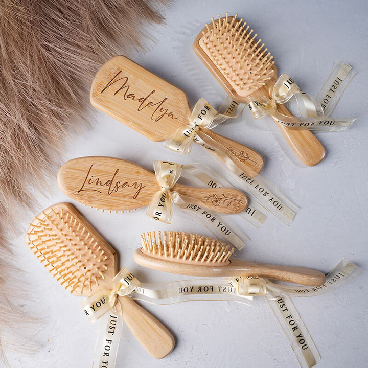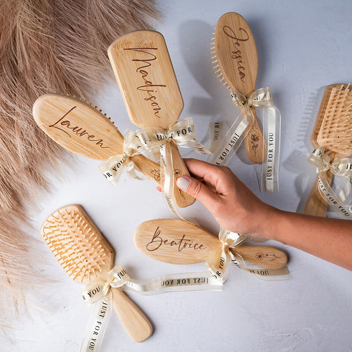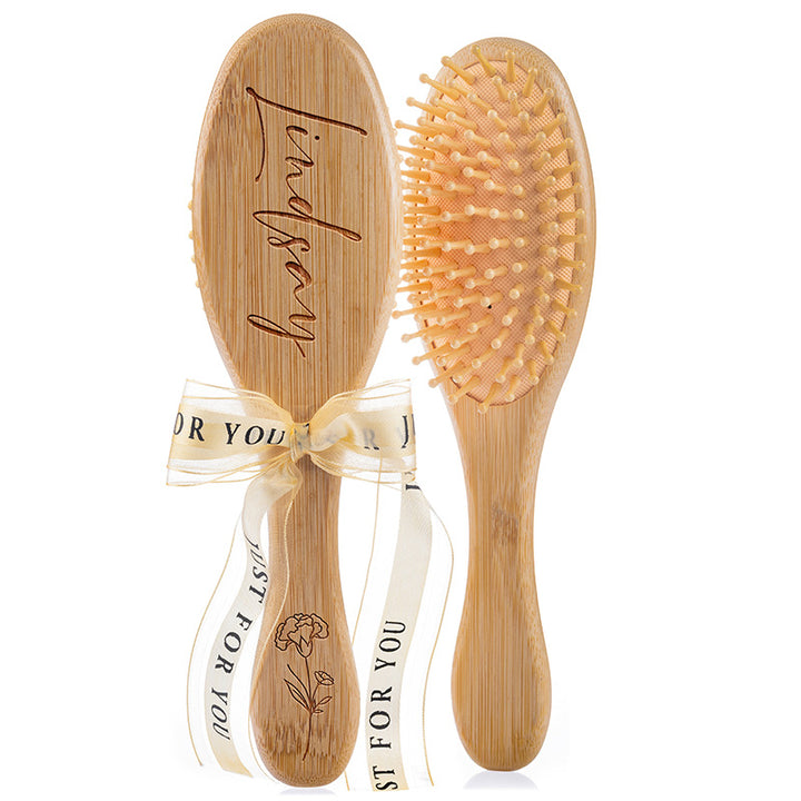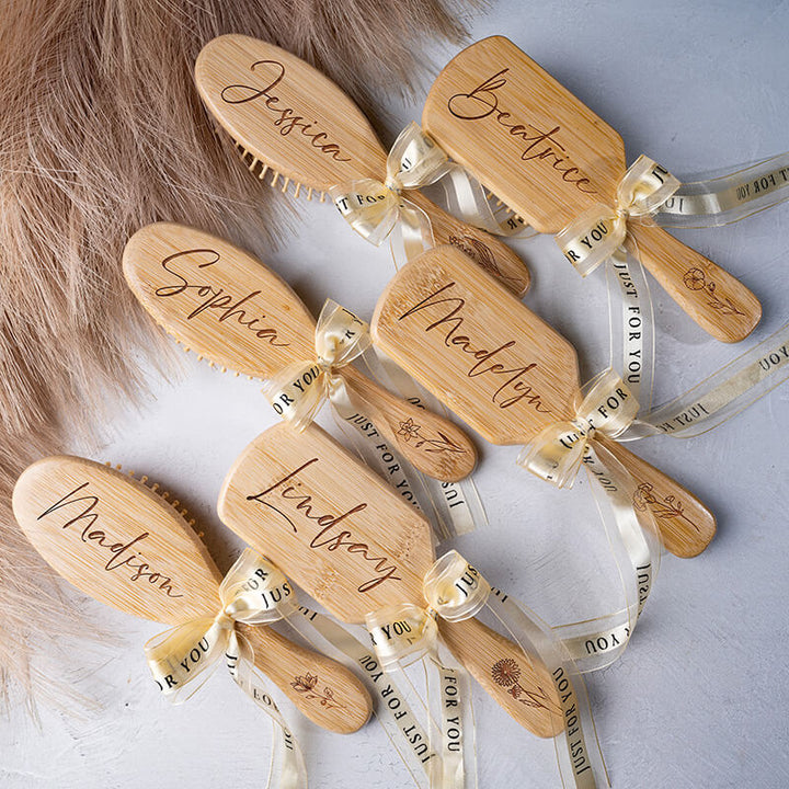 Crafted from 100% natural bamboo, this personalized brush is designed to glide through her hair gently. This brush is, as it’s made from bamboo, naturally anti-static, helping reduce the frizz and flyaways for a smoother and sleeker finish. As Giftshire, we professionally engrave the back of the brush with a name of your choice in a stylish font, along with a birthflower, which is a meaningful symbol, especially as a birthday present. The smooth and polished bamboo bristles gently massage, and the bristles are set in a flexible pneumatic cushion that absorbs shock and prevents harsh pulling, minimizing breakage. There are two brushes to choose from that come beautifully adorned with a cream-colored and personalized just for you—a lovely gift for women.