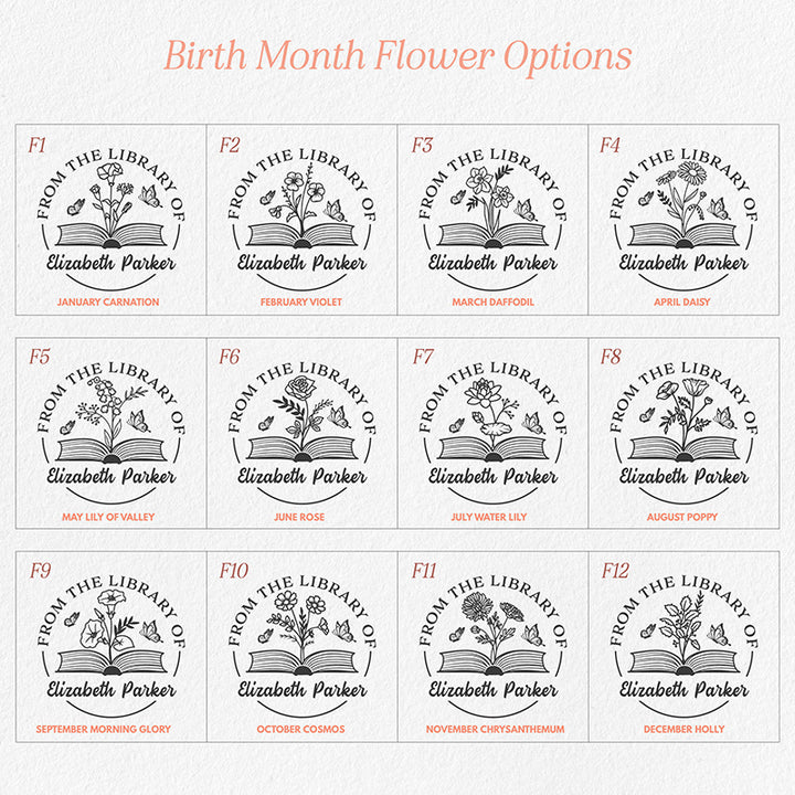 To ensure the indelible distinctiveness of your specific mark, you possess the capacity to select one of twelve elaborately crafted botanical illustrations. These elegant flowers, signifying each respective month of birth, are designed to reside gracefully adjacent to your personalized appellation. This deliberate integration culminates in a truly intimate and refined “Ex Libris” declaration.