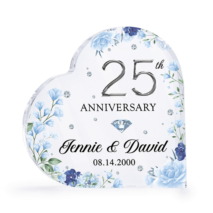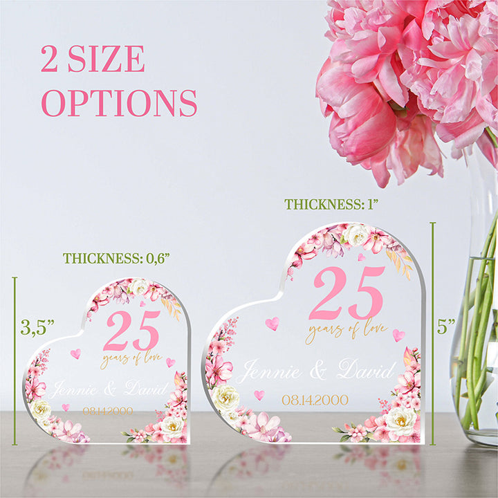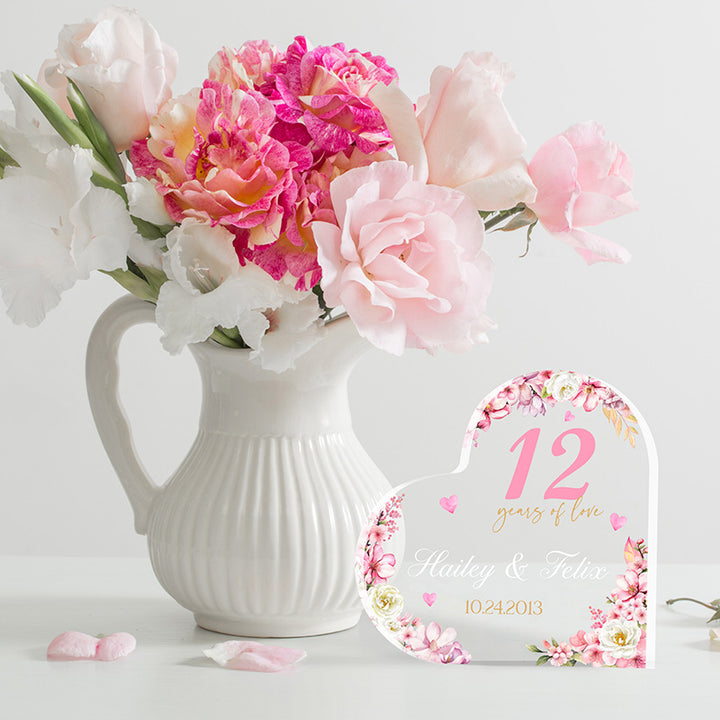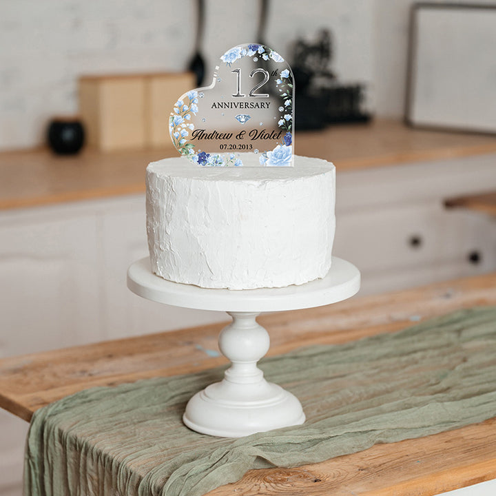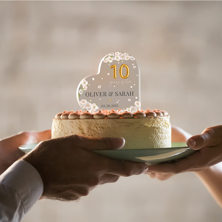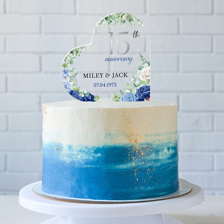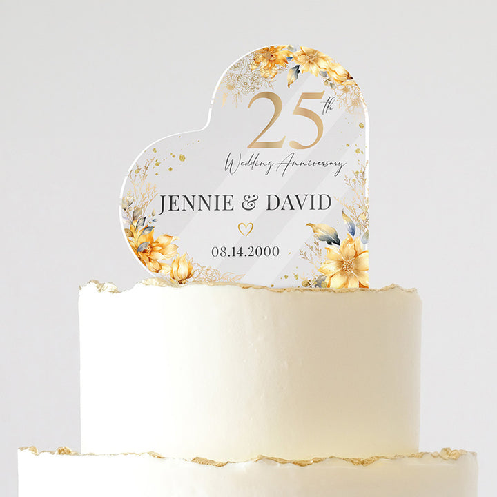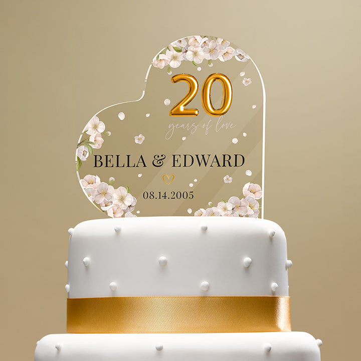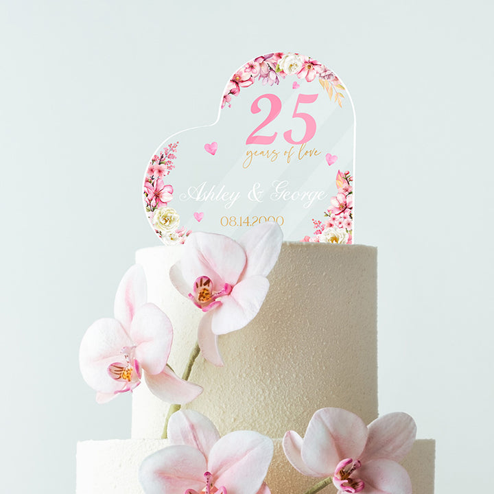 Made from premium crystal-clear acrylic, this anniversary cake topper comes in a heart-shaped block design that stands on its own, no additional support required. Available in two sizes, it fits a variety of cake dimensions. Each floral design is printed using durable UV technology, ensuring a long-lasting, vibrant finish that captures both elegance and resilience. Personalization with names, wedding dates, and anniversary numbers is simple yet refined, creating a sophisticated, memorable accent for your celebration that also doubles as a lasting keepsake.