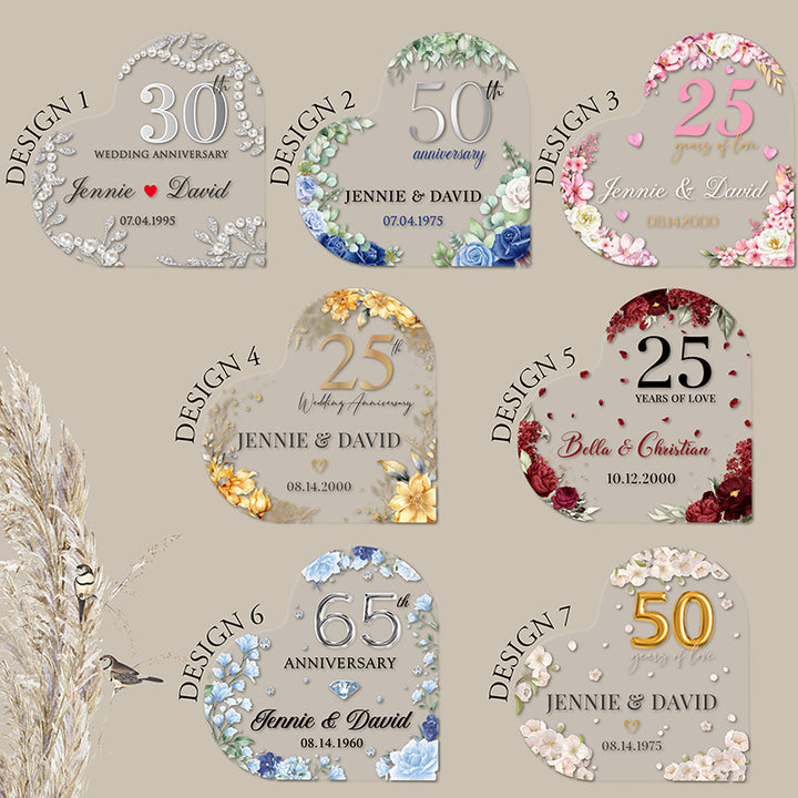 Mark the moments that matter most with our Anniversary Cake Topper, a radiant celebration of love captured in crystal-clear acrylic. Heart-shaped and adorned with 7 elegantly floral designs, this topper transforms any cake into a centerpiece of romance and joy. Personalize it with the couple’s names, wedding date, and anniversary year to honor milestones or simply celebrate your journey together. Beyond its role on the cake, this topper gracefully doubles as a lasting keepsake—ready to shine on a shelf, tabletop, or mantel—reminding couples of their shared memories and the years of love they’ve cherished together.