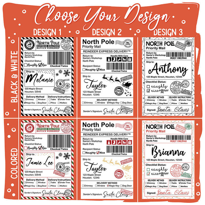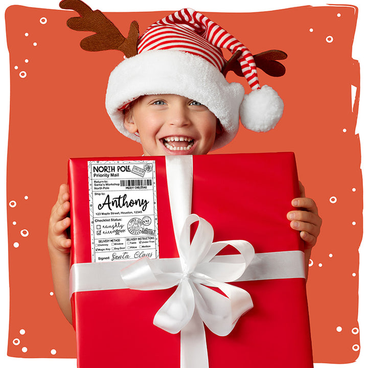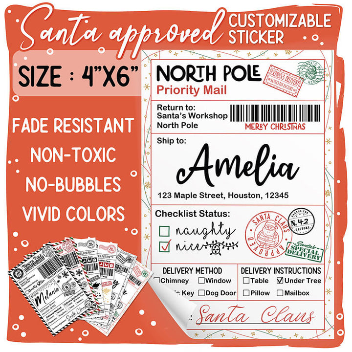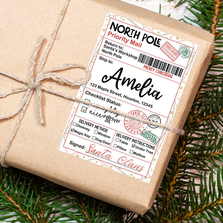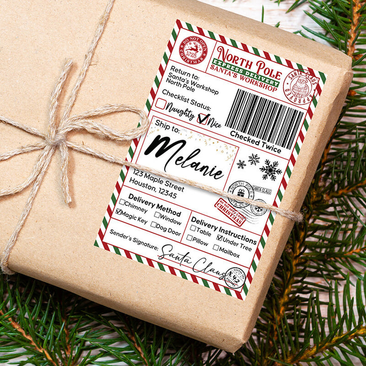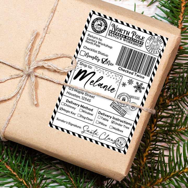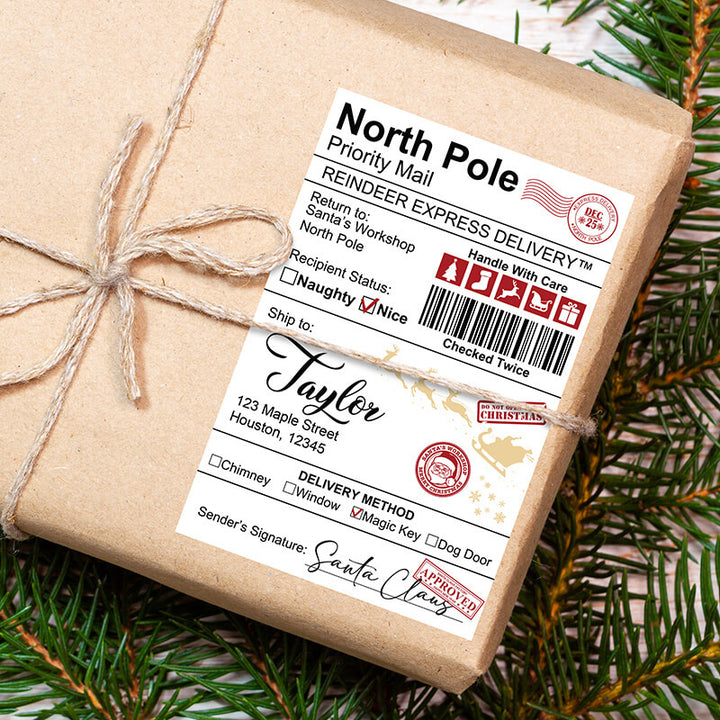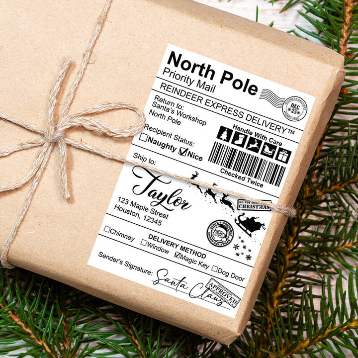 Printed using vibrant sublimation on waterproof, durable sticker material, each label is made to survive the excitement of curious little hands, Christmas morning chaos, and even a sprinkle of holiday sparkle. With multiple design options—from classic black & white postal styles to colorful North Pole express labels—you can pick the look that matches your family’s holiday aesthetic. This isn’t just a sticker; it’s a keepsake that deepens the magic of Christmas and keeps the Santa tradition glowing bright in your home year after year.