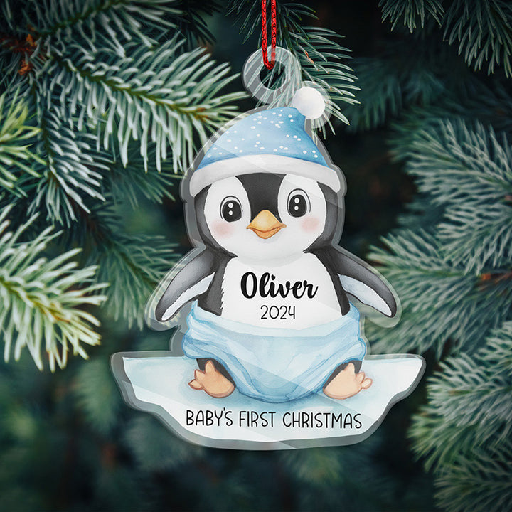 Features an adorable baby penguin sitting on a "Baby's First Christmas" ice float.