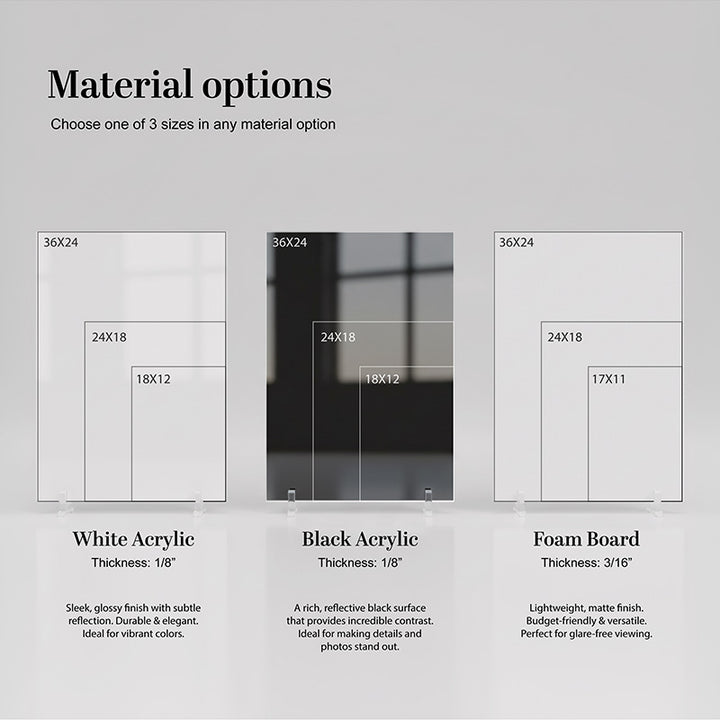 - Foam Board: 3/16" thickness with a lightweight, matte finish that prevents glare.