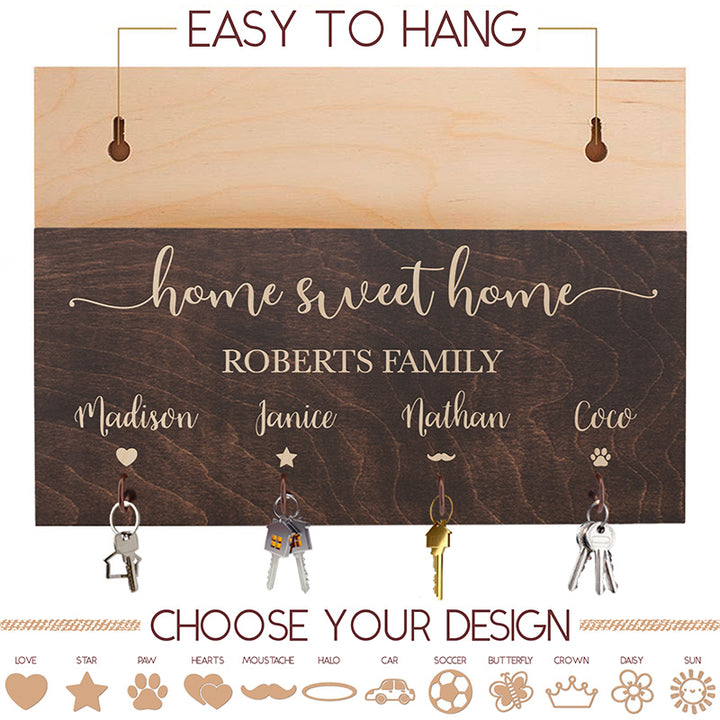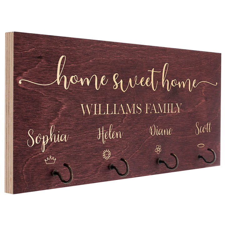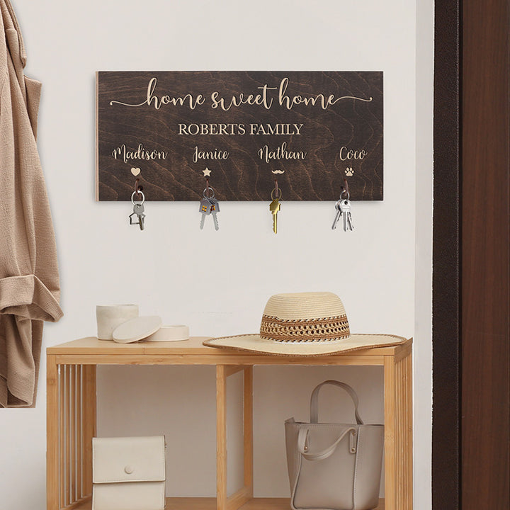 Say hello to order and elegance! Giftshire presents the tailored "Home Sweet Home" hook rack for your keys. This bespoke wall-mounted organizer is the ideal item for any foyer or utility area (mudroom), guaranteeing that searching for your keys becomes a thing of the past.