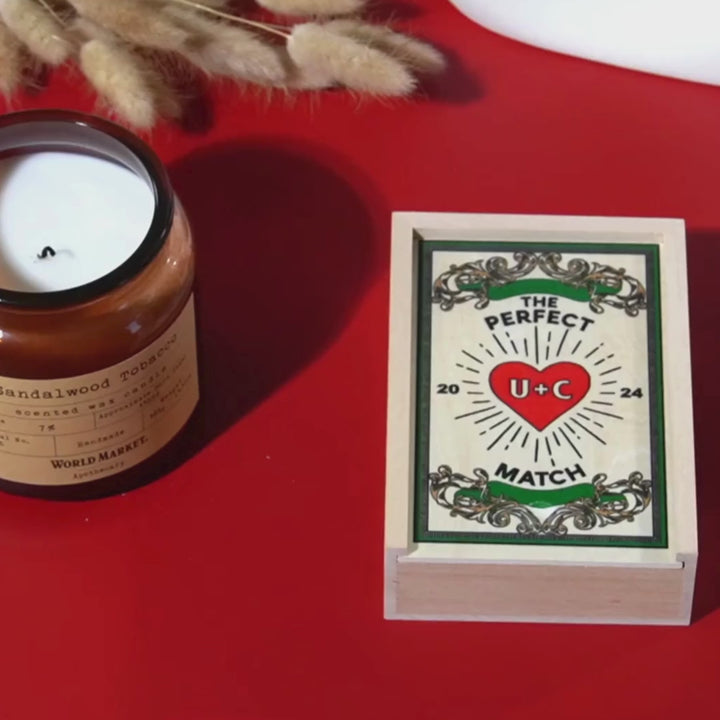 The handcrafted wooden matchbox can be personalized with initial designs with the couple's first letter of their names. It’s available in 6 colors and has a sliding lid.