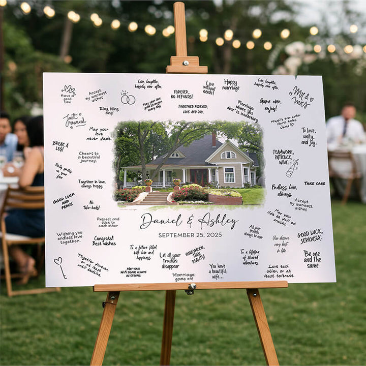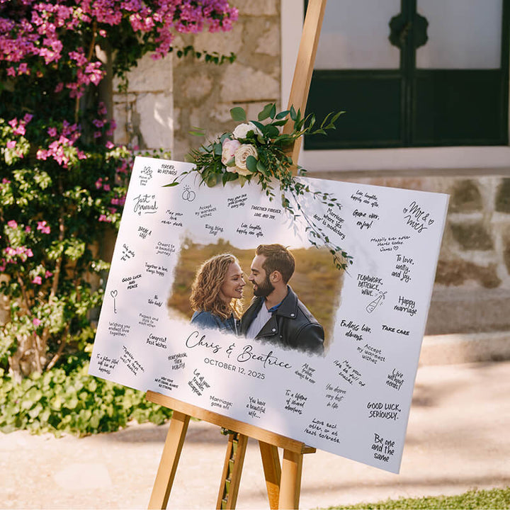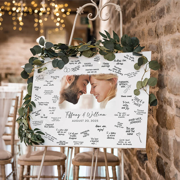 Let your guests create a lifetime keepsake of your wedding day or engagement party by writing their best wishes and heartfelt quotes in our Personalized Wedding Guestbook. We designed an Alternative guestbook that you can make totally yours and special. You can upload your favorite couple photo and complete customization with your names and wedding dates. It is beyond being a keepsake of your day; it also makes a great decoration for the photos of the night. Size and material options will make a perfect match with your event.