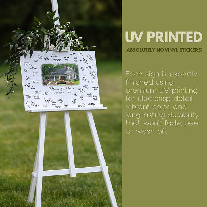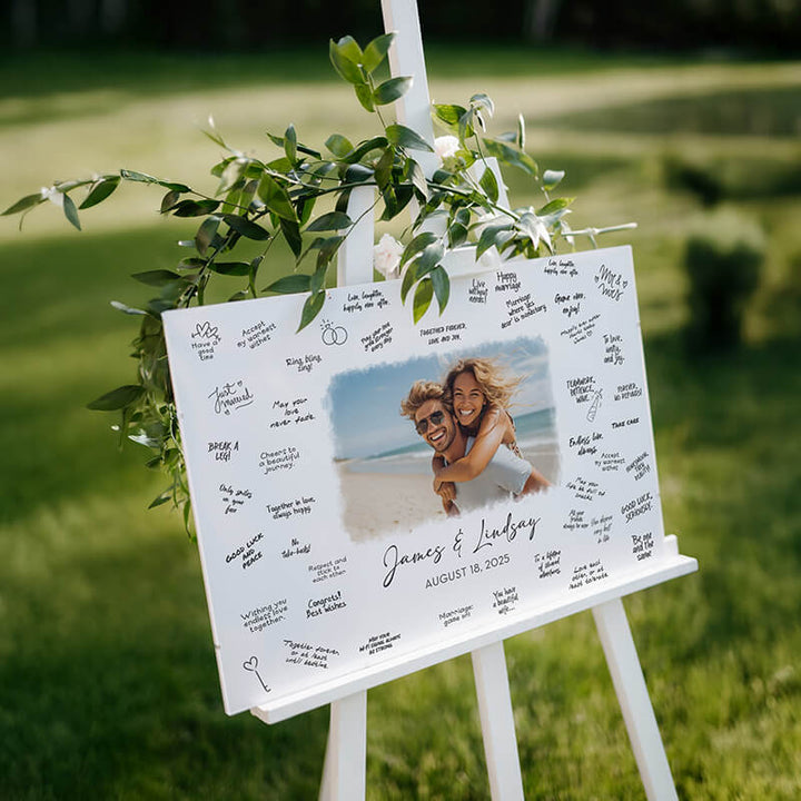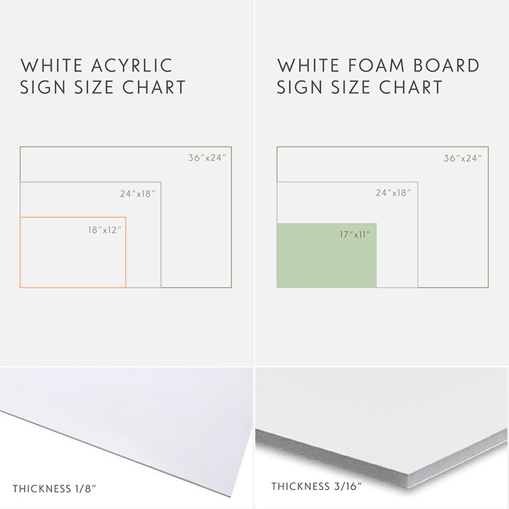 We use Premium quality of both materials. You can choose white acrylic for a sleek, modern finish or white foam board for a lightweight, budget-friendly option. Both materials offer a smooth writing surface for guests.